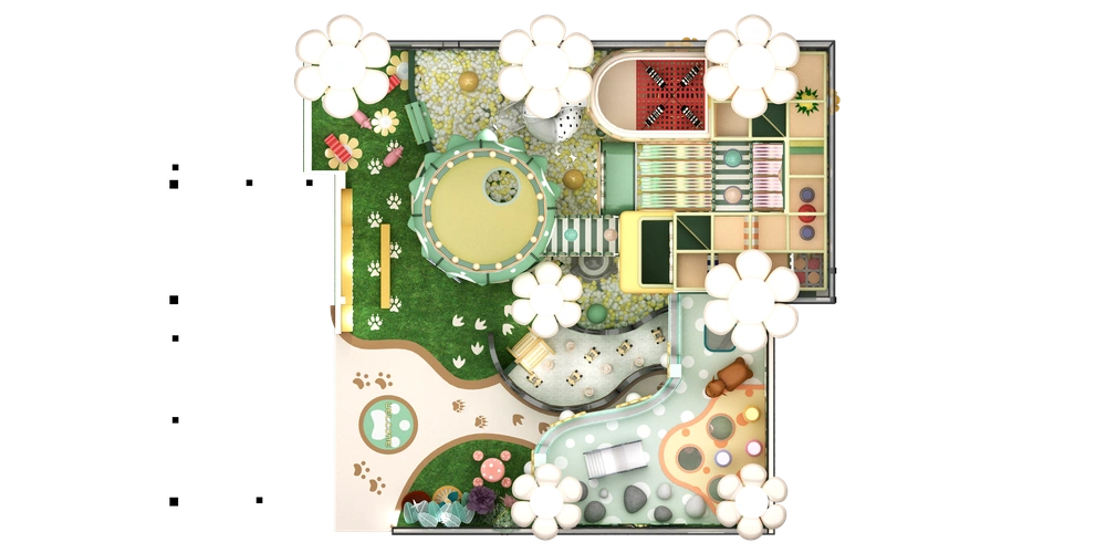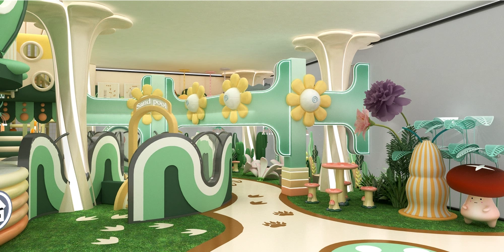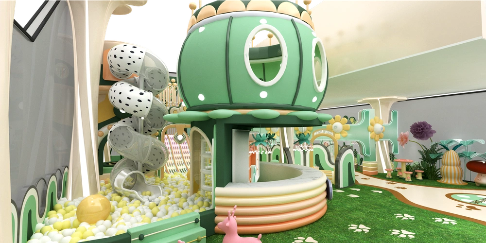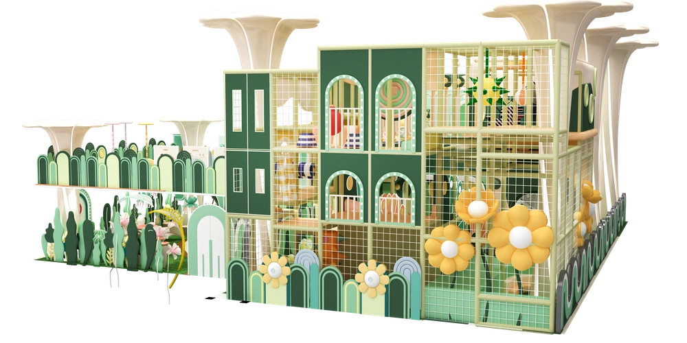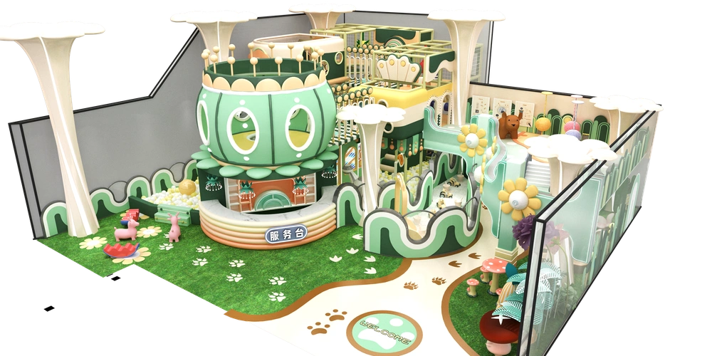 Natural green indoor playground featuring forest animals tunnels slides and climbing walls creating an immersive play and adventure experience