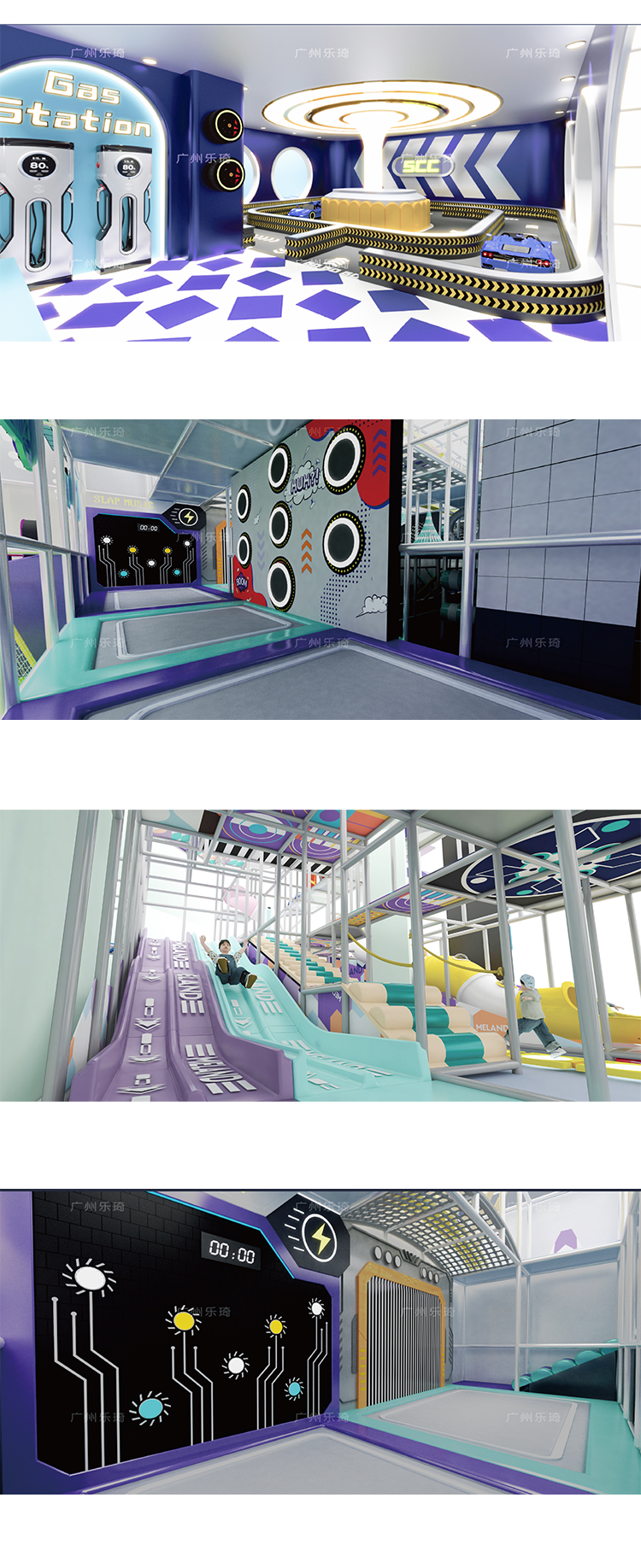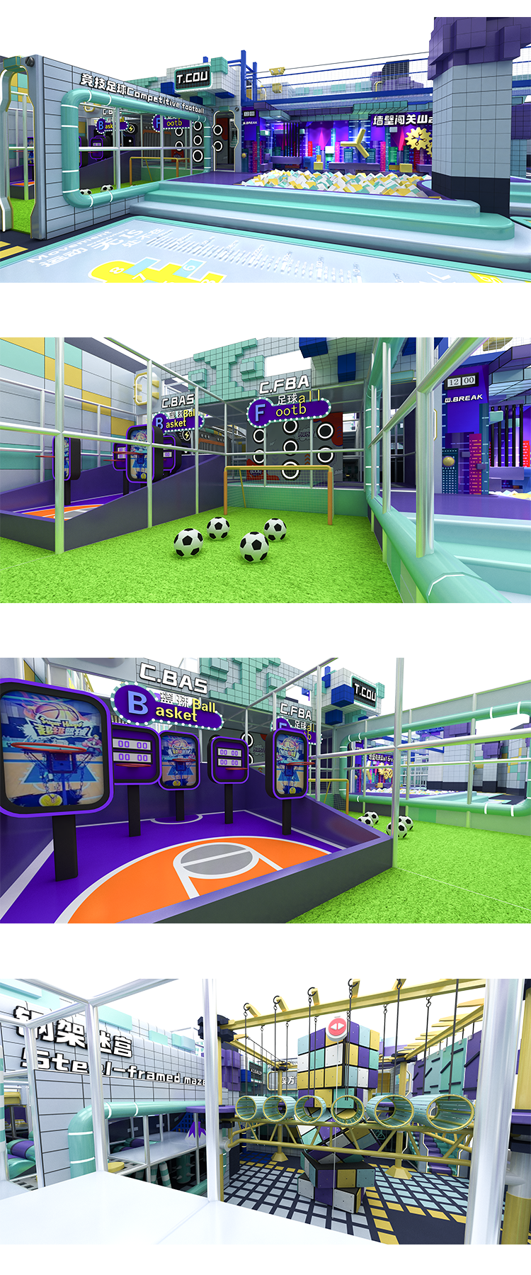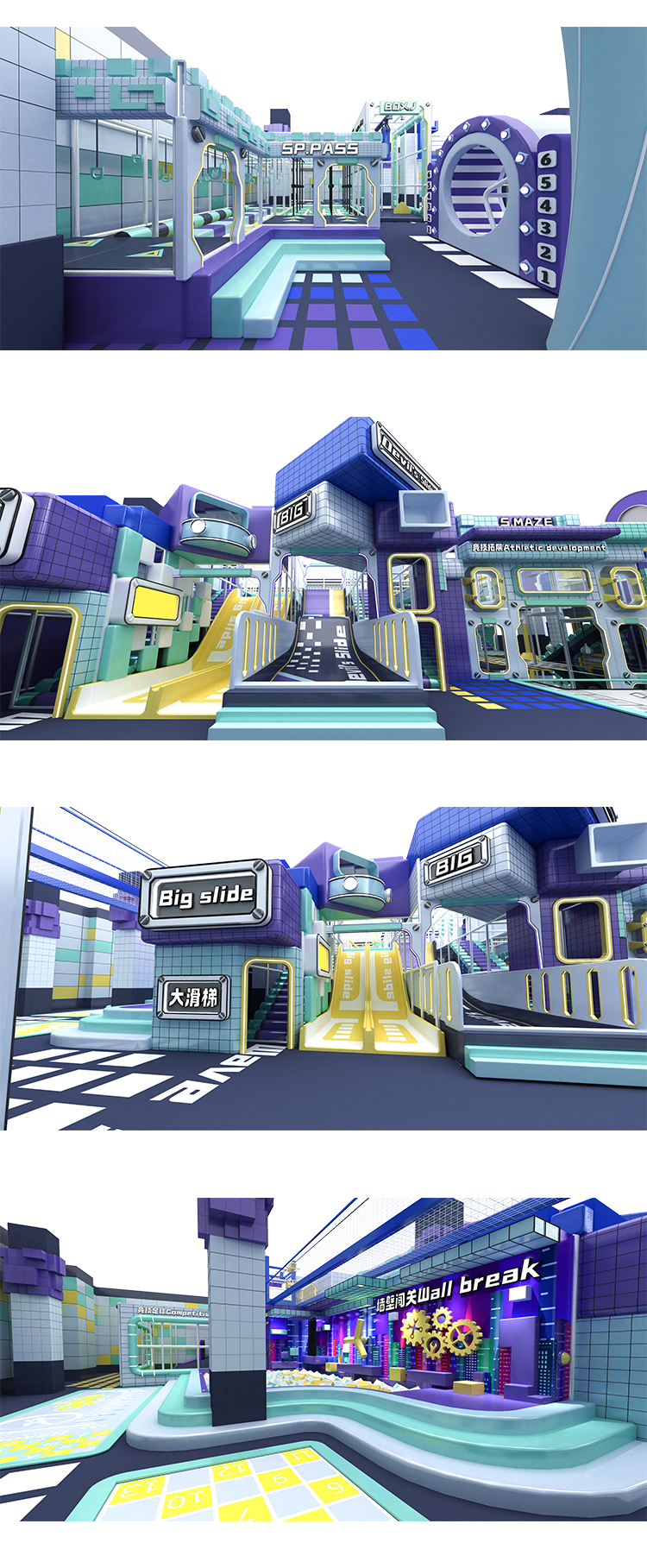 From a distance, the Quantum Theme stands out. Inspired by space exploration, science fiction, and dynamic light elements, this playground uses bold geometry, neon color accents, and layered play volumes to create a strong visual hook—essential for shopping malls, FECs, and indoor playground parks.